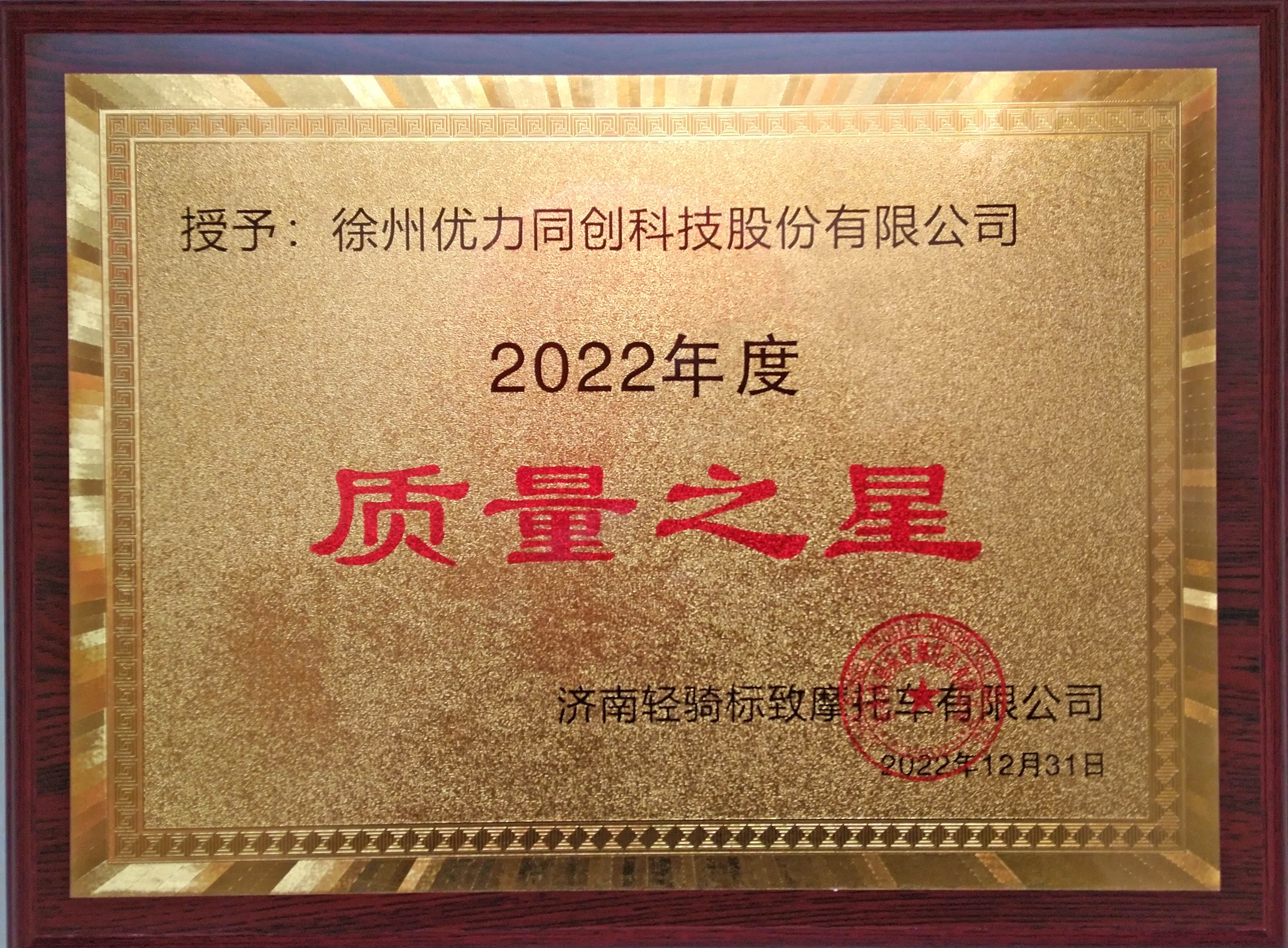 2022年12月31日,获济南轻机标志摩托车有限公司颁发质量之星荣誉证书,是对我公司一年以来的工作肯定,公司将继续做好产品、好质量、好服务,持续为客户提供高价值产品与服务。