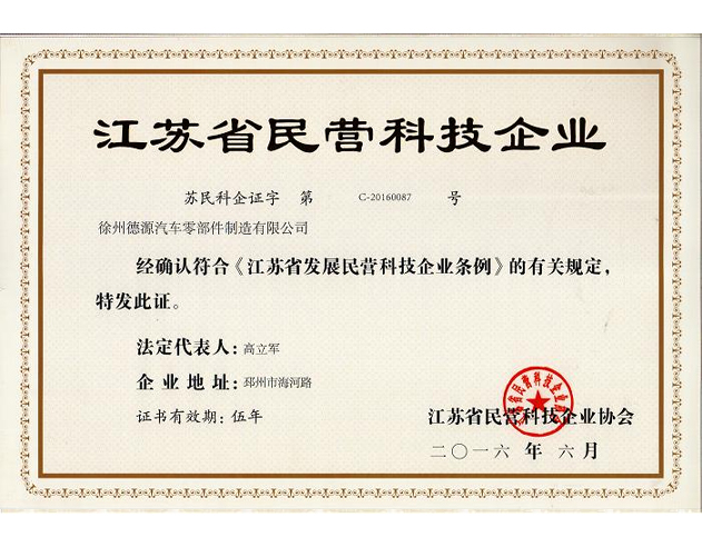 公司于2016年6月获江苏省民营科技企业协会颁发江苏省民营科技企业证书