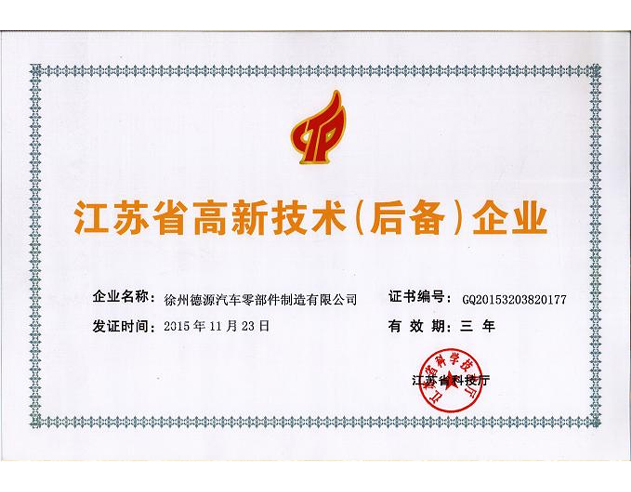 2016年2月,获江苏省科学技术厅颁发江苏省高新技术企业证书。